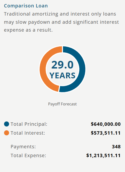 One note regarding this example. This example was using a Rate Trend of “Remain a Current Rate”. If we selected the Rate Trend to use a Historical Average Rate, the loan would be paid off in 13.1 years and the savings would be $329,107, with an Effective APR of 2.282%. We like to use a more conservative approach in our examples.